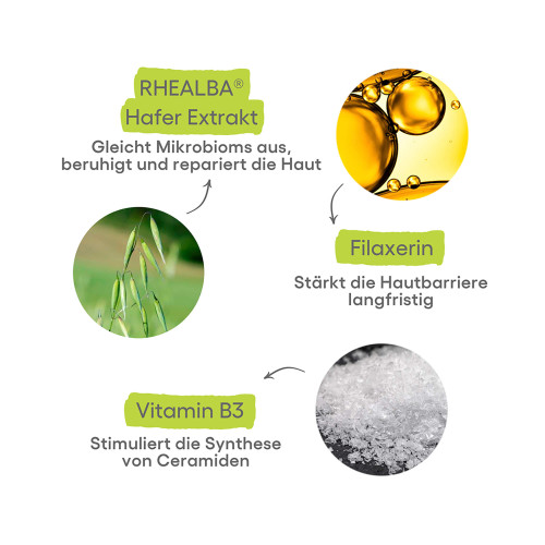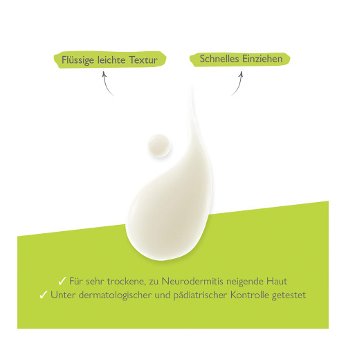 Die Rückfettende Milch lindert den Juckreiz* und hilft die Rötungen bei trockener Haut, die zu atopischem Ekzem neigt, so zu reduzieren, dass starke Irritationen seltener auftreten. Seine 360°-Wirkung reduziert auch trockene Haut, stärkt die Hautbarriere und hilft, das Mikrobiom wieder ins Gleichgewicht zu bringen**. Eine nährende Lotion mit einer flüssigen, nicht klebrigen und nicht fettenden Textur für eine dreifach beruhigende Wirkung mit nur einer Anwendung pro Tag. Eine Formulierung auf der Basis von Rhealba® Haferextrakt, mit 95 % Aktivstoffen natürlichen Ursprungs und ohne Duftstoffe, von Geburt an geeignet. Eine tägliche, gezielte, wirksame und beruhigende Pflege, welche die Sensibilität der trockenen, zur Atopie neigenden Haut kontrolliert und das tägliche Leben verbessert.