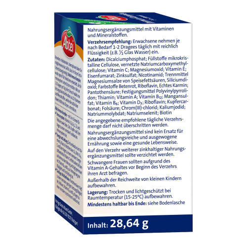 Dicalciumphosphat; Füllstoffe mikrokristalline Cellulose, vernetzte Natriumcarboxymethylcellulose; Vitamin C; Magnesiumoxid; Vitamin E; Eisenfumarat; Zinksulfat; Nicotinamid; Trennmittel Magnesiumsalze von Speisefettsäuren, Siliciumdioxid; Farbstoffe Betenrot, Riboflavin, Echtes Karmin; Pantothensäure; Festigungsmittel Polyvinylpyrrolidon; Thiamin; Vitamin A; Vitamin B12; Mangansulfat; Vitamin B6; Vitamin D3; Riboflavin; Kupfercarbonat; Folsäure; Chrom(III)-chlorid; Kaliumjodid; Natriummolybdat; Natriumselenit; Biotin.