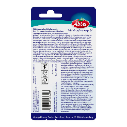 Abtei Japanisches Heilpflanzenöl. Wirkstoff: Minzöl. Anwendungsgebiet: Innerliche Anwendung bei: Blähsucht; funktionellen Magen-, Darm- und Gallenbeschwerden; Katarrhen der oberen Luftwege. Äußerliche Anwendung bei: Muskelschmerzen und nervenschmerzenähnlichen Beschwerden; Katarrhen der oberen Luftwege.