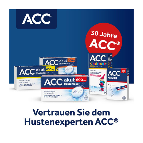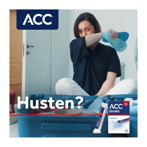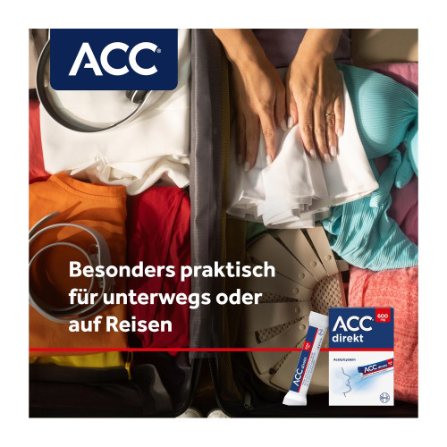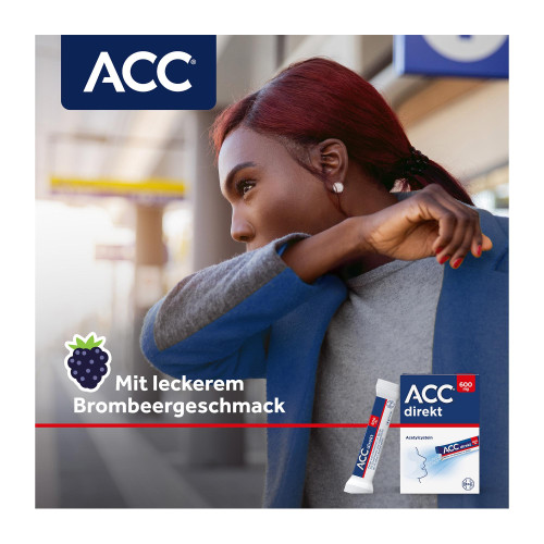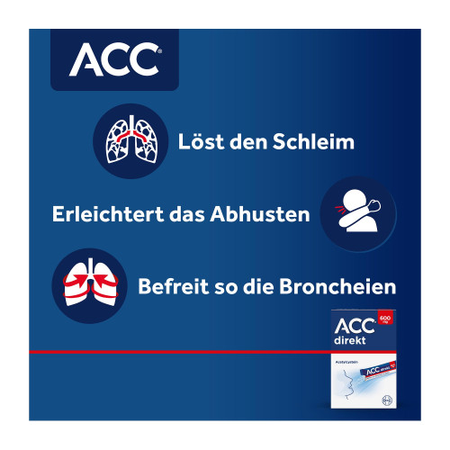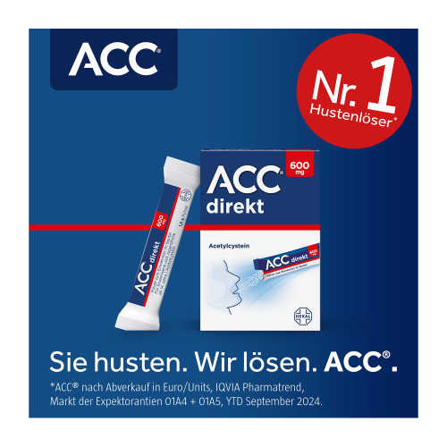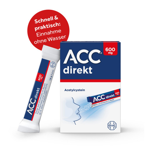 ACC® direkt 600 mg Pulver zum Einnehmen im Beutel. Wirkstoff: Acetylcystein. Anwendungsgebiete: Zur Schleimlösung und zum erleichterten Abhusten bei Atemwegserkrankungen mit zähem Schleim. Dieses Arzneimittel darf nur bei Erwachsenen und Jugendlichen ab 14 Jahre angewendet werden. Warnhinweis: Enthält Sorbitol und Aspartam.