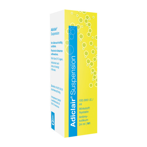 Adiclair® 100.000 I.E./ml Suspension. Wirkstoff: Nystatin. Anwendungsgebiete: Zur topischen Behandlung nystatinempfindlicher Pilzinfektionen des Mund- und Rachenraumes, der Speiseröhre und des Magendarmtraktes (Candidainfektion).