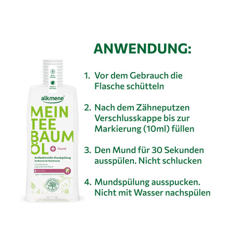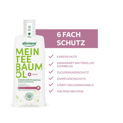 Die alkmene MEIN TEEBAUMÖL Antibakterielle Mundspülung mit der einzigartigen Wirkkombination aus Teebaumöl und Fluorid wirkt 6-fach und kann helfen, Zahnfleischbluten zu reduzieren und Entzündungen vorzubeugen: