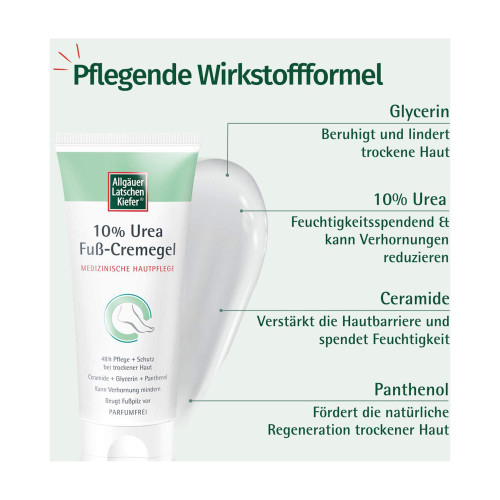 Das Allgäuer Latschenkiefer 10% Urea Fuß-Cremegel mit seiner leichten und erfrischenden Formel bietet eine intensiv feuchtigkeitsspendende Pflege, die die Haut spürbar geschmeidig macht und vor Austrocknung schützt.