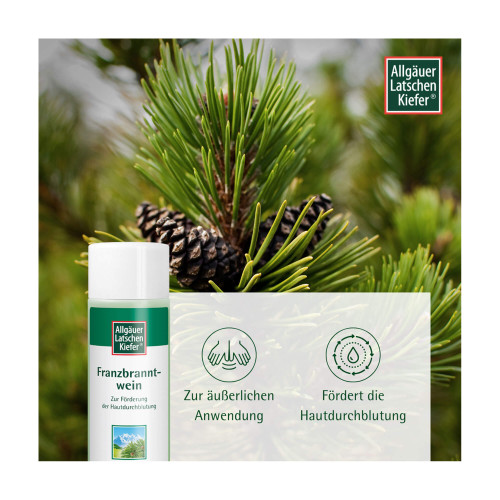 Allgäuer Latschenkiefer Franzbranntwein, Lösung zur Anwendung auf der Haut. Anwendungsgebiete: Für Erwachsene, Jugendliche und Kinder ab 30 Monaten. Zur äußerlichen Anwendung. Zur Förderung der Hautdurchblutung. Warnhinweise: Enthält Macrogolglycerolricinoleat 60 (Ph.Eur.), Duftstoffe mit Allergenen und Alkohol (Ethanol). Packungsbeilage beachten. Dieses Arzneimittel sollte nicht mit Hautwunden in Berührung kommen.
