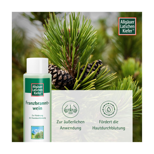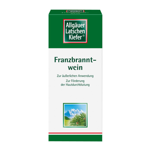 Allgäuer Latschenkiefer Franzbranntwein, Lösung zur Anwendung auf der Haut. Anwendungsgebiete: Für Erwachsene, Jugendliche und Kinder ab 30 Monaten. Zur äußerlichen Anwendung. Zur Förderung der Hautdurchblutung. Warnhinweise: Enthält Macrogolglycerolricinoleat 60 (Ph.Eur.), Duftstoffe mit Allergenen und Alkohol (Ethanol). Packungsbeilage beachten. Dieses Arzneimittel sollte nicht mit Hautwunden in Berührung kommen.