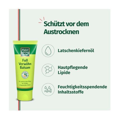 Der Allgäuer Latschenkiefer Fußverwöhnbalsam schenkt beanspruchten Füßen genau die Aufmerksamkeit, die sie verdienen. Die ausgewogene Pflegeformel mit Latschenkiefernöl, hautpflegenden Lipiden und feuchtigkeitsspendenden Inhaltsstoffen, wie Glycerin, versorgt die Füße intensiv mit Feuchtigkeit, schützt vor dem Austrocknen und trägt zu einem angenehm geschmeidigen Hautgefühl bei. Die leichte Textur zieht schnell ein und hinterlässt kein unangenehmes Fettgefühl – ideal für die tägliche Anwendung.