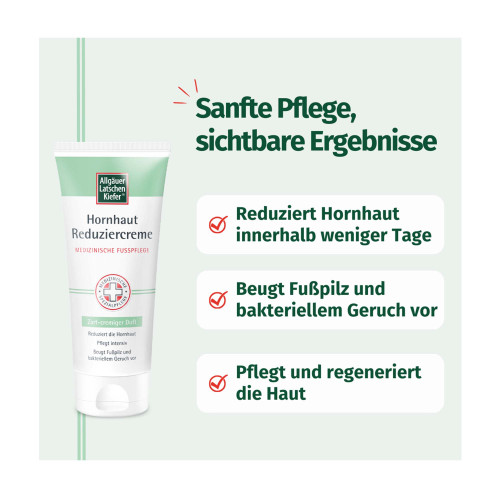 Die Hornhaut Reduziercreme Cremig von Allgäuer Latschenkiefer ist eine Fußpflege, die jahrelange Expertise mit wertvollen Inhaltsstoffen kombiniert. Sie wirkt sanft, aber dennoch effektiv bei der Reduzierung unerwünschter Hornhaut. Ihre Anti-Hornhaut-Formel kombiniert wertvolle Fruchtsäuren, wie Salicyl- und Glykolsäure, um Hornhaut gezielt zu reduzieren und das Hautbild sichtbar zu verbessern – und das bereits innerhalb weniger Tage.