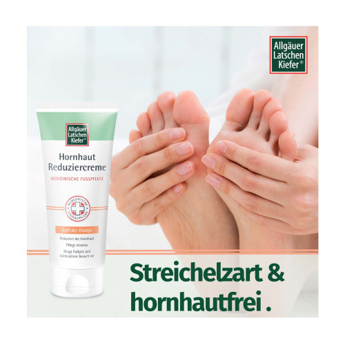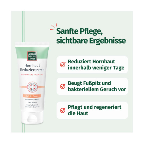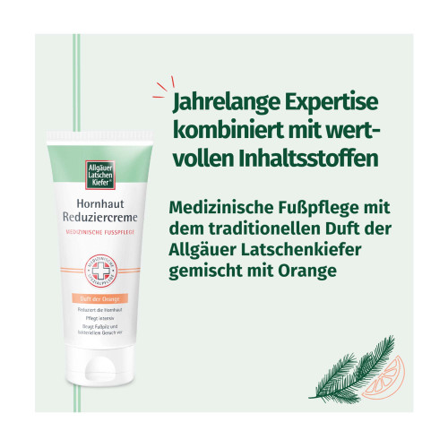 Die Hornhaut Reduziercreme Orange von Allgäuer Latschenkiefer ist eine Fußpflege, die jahrelange Expertise mit wertvollen Inhaltsstoffen kombiniert. Sie wirkt sanft, aber dennoch effektiv bei der Reduzierung unerwünschter Hornhaut. Ihre Anti-Hornhaut-Formel kombiniert wertvolle Fruchtsäuren, wie Salicyl- und Glykolsäure, um Hornhaut gezielt zu reduzieren und das Hautbild sichtbar zu verbessern – und das bereits innerhalb weniger Tage.