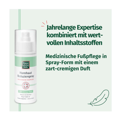 Das Hornhaut Reduzierspray von Allgäuer Latschenkiefer reduziert störende Hornhaut ganz ohne zusätzliche Arbeitsschritte. Die Fußpflege vereint jahrelange Expertise mit wertvollen Inhaltsstoffen.