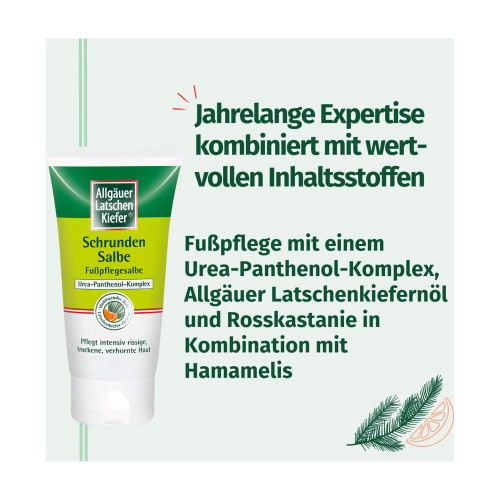 Die Schrundensalbe Orange von Allgäuer Latschenkiefer wurde entwickelt, um derartigen Herausforderungen entgegenzuwirken. Sie pflegt intensiv trockene, rissige oder verhornte Haut und unterstützt die Hautregeneration. Ihre Formulierung kombiniert das bewährte Allgäuer Latschenkiefernöl mit einem Urea-Panthenol-Komplex, der intensiv Feuchtigkeit spendet. Zusätzlich enthält die Salbe eine Pflegekombination mit Rosskastanie und Hamamelis, welche die Regeneration der Haut unterstützt. Während des Auftragens verströmt sie den traditionellen Duft von Allgäuer Latschenkiefer und Orange.