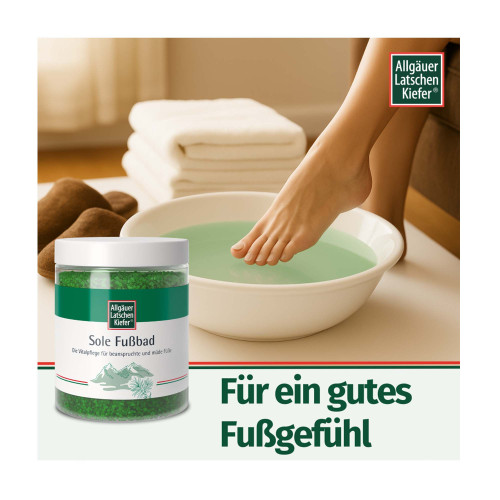 Traditionell werden Solebäder zur Förderung des allgemeinen Wohlbefindens eingesetzt. Auch das Sole Fußbad von Allgäuer Latschenkiefer kann auf angenehme Weise zur Entspannung beitragen und eignet sich besonders zur regelmäßigen Anwendung im Rahmen der Fußpflege – etwa bei trockener, strapazierter Haut oder zur sanften Pflege bei Druckstellen.