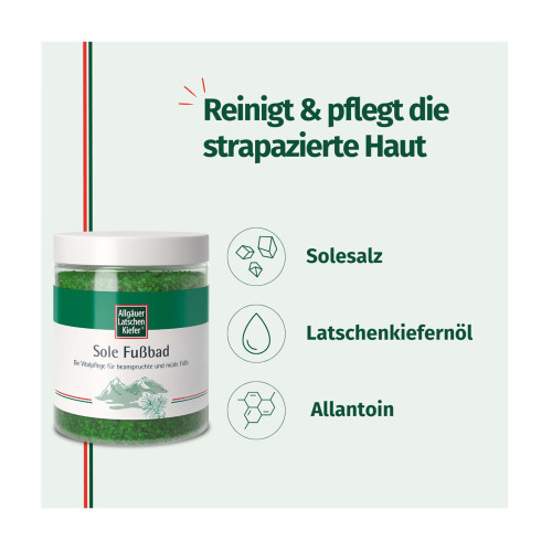 Die Kombination aus Solesalz, ätherischem Latschenkiefernöl sowie pflegendem Allantoin kann dabei unterstützen, das Hautgefühl zu verbessern und die Füße spürbar zu beleben. Die salzhaltige Sole, die sich beim Auflösen im warmen Wasser bildet, reinigt die Füße sanft und schafft eine wohltuende Basis für gepflegte Haut. Allantoin ist bekannt für seine hautberuhigenden Eigenschaften und kann helfen, die natürliche Regeneration der Haut zu unterstützen.