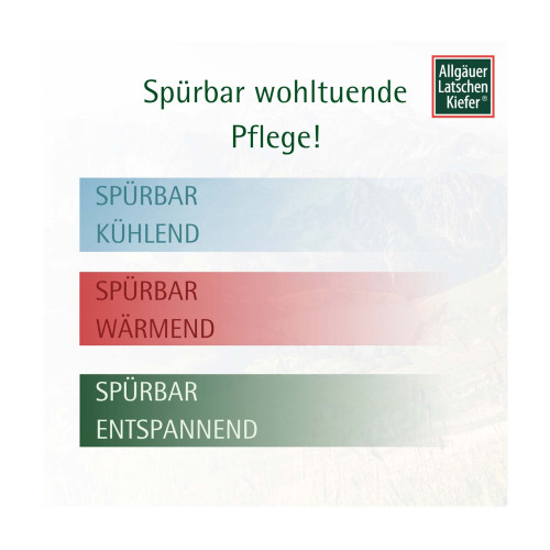 Im Zentrum der Formel steht Spanischer Pfefferextrakt, der eine durchwärmende Wirkung auf der Haut entfaltet. Diese wohltuende Wärme kann in Kombination mit einer Massage die Durchblutung fördern und so dazu beitragen, muskuläre Verspannungen zu lösen. Ergänzt wird der Wärmewirkstoff durch eine sorgfältig abgestimmte Auswahl an bewährten Inhaltsstoffen: Beinwell, Arnika, Campher, Magnesium und Panthenol. Das bewährte Allgäuer Latschenkiefernöl, kombiniert mit Salbei- und Rosmarinöl, rundet die Rezeptur ab – für ein angenehm vitalisierendes Hautgefühl und einen entspannend-wärmenden Effekt.