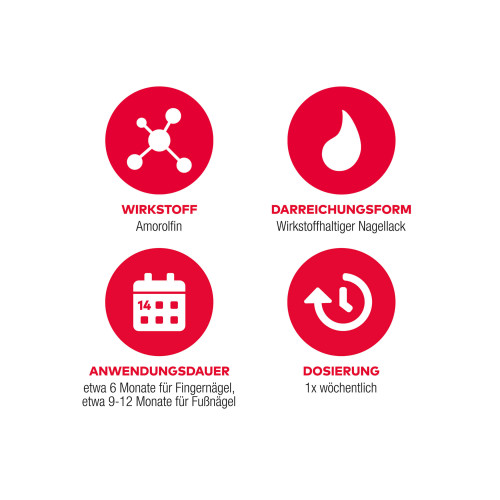 - Wenden Sie das Arzneimittel einmal wöchentlich an bis die Infektion abklingt und gesunde Nägel nachgewachsen sind.