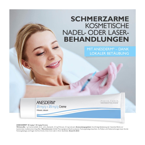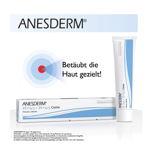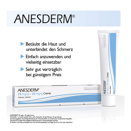 Anesderm 25 mg/g + 25 mg/g Creme . Anwendungsgebiete: wirkt, indem es kurzfristig die Hautoberfläche betäubt. Es wird vor bestimmten medizinischen Eingriffen auf die Haut aufgebracht.