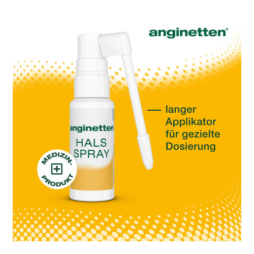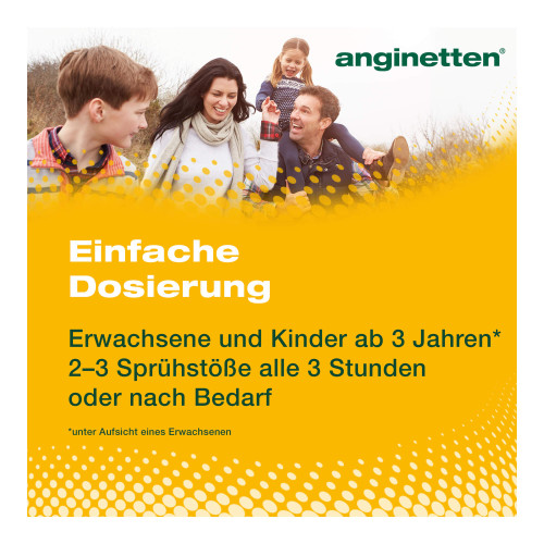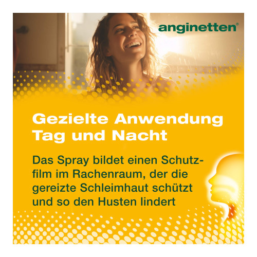 Das anginetten® Hals Spray 2 in 1 ist ein Medizinprodukt mit einer Honig-Rezeptur zur Beruhigung von Husten und zur Linderung von Halschmersymptomen. Das Spray bildet einen Schutzfilm im Rachenraum, der die gereizte Schleimhaut schützt und den Husten lindert. Das anginetten® Hals Spray 2 in 1 kann von Erwachsenen und Kindern ab 3 Jahren verwendet werden. Bei Kindern muss das Spray immer unter der Aufsicht eines Erwachsenen verabreicht werden.