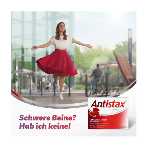 Antistax® extra Venentabletten. Wirkstoff: Trockenextrakt aus roten Weinrebenblättern. Anwendungsgebiete: Zur Anwendung bei Erwachsenen. Zur Behandlung von Beschwerden bei Erkrankungen der Beinvenen (chronische Veneninsuffizienz), die sich zum Beispiel durch Schmerzen und Schweregefühl in den Beinen, Krampfadern, nächtliche Wadenkrämpfe, Juckreiz und geschwollene Beine (Beinödeme) äußern.