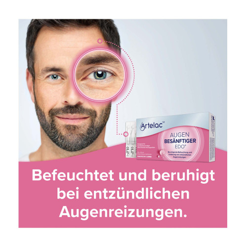 Artelac® Augenbesänftiger EDO® reduziert die Bindehaut-Entzündung durch eine chemischphysikalische Stimulierung (nicht- pharmakologische Wirkung) und befeuchtet mittel bis schwere Formen des Trockenen Auges mit entzündlichen Symptomen.
