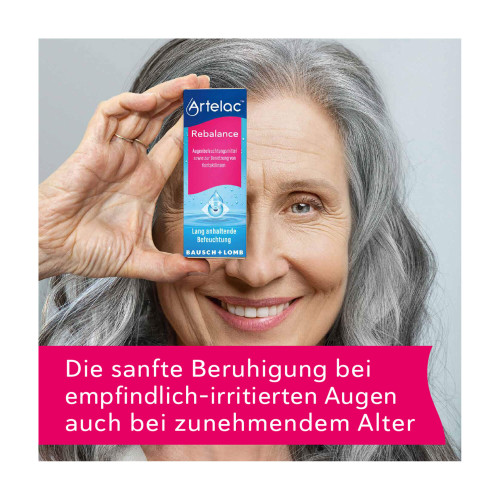 Bestimmte Umwelteinflüsse, aber auch körpereigene Faktoren, können tagsüber zu empfindlich-irritierten trockenen Augen führen. Die beruhigenden Augentropfen Artelac® Rebalance schaffen Abhilfe: Sie ergänzen den natürlichen Tränenfilm mit zusätzlichen Elektrolyten und befeuchten die Augen mit Hyaluronsäure und dem Inhaltsstoff PEG 8000, der Wasser auf der Augenoberfläche, im Tränenfilm bindet.
