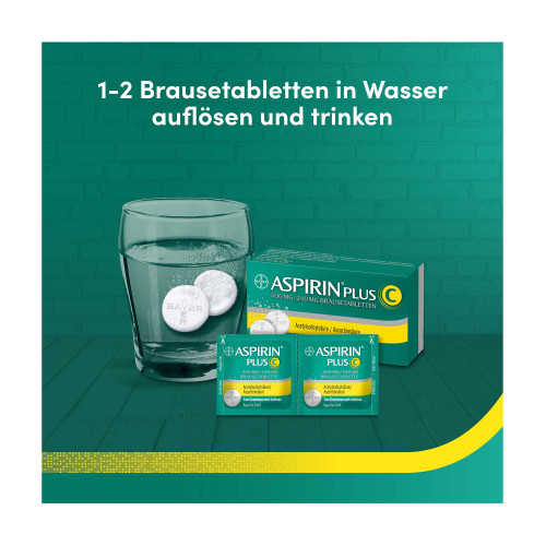 Aspirin Plus C Brausetabletten. Anwendungsgebiete:Leichte bis mäßig starke Schmerzen wie Kopfschmerzen; Zahnschmerzen; Regelschmerzen; schmerzhafte Beschwerden, die im Rahmen von Erkältungskrankheiten auftreten (z. B. Kopf-, Hals- und Gliederschmerzen); Fieber. Bitte beachten Sie die Angaben für Kinder. Warnhinweis: Enthält Natriumverbindungen. Packungsbeilage beachten.