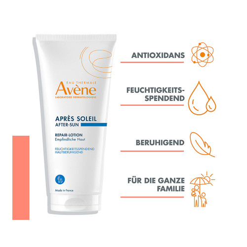 Die After Sun Lotion beruhigt sofort die empfindliche Haut, die nach dem Sonnenbad überhitzt ist. Sie versorgt Gesicht und Körper bis zu 48 Stunden lang mit Feuchtigkeit*. Ihre cremige, schmelzende Textur sorgt für ein angenehmes Gefühl von intensiver Frische. Ihre Formulierung ist reich an Avène Thermalwasser und angereichert mit Antioxidantien und pflegendem Jojobaöl, beruhigt die Haut und hüllt sie in einen zarten Duft. Sie ist geeignet für die ganze Familie, Erwachsene und Kinder, ab 2 Jahren.