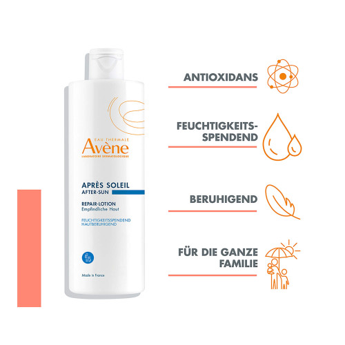 Die After Sun Lotion beruhigt sofort die empfindliche Haut, die nach dem Sonnenbad überhitzt ist. Sie versorgt Gesicht und Körper bis zu 48 Stunden lang mit Feuchtigkeit*. Ihre cremige, schmelzende Textur sorgt für ein angenehmes Gefühl von intensiver Frische. Ihre Formulierung ist reich an Avène Thermalwasser und angereichert mit Antioxidantien und pflegendem Jojobaöl, beruhigt die Haut und hüllt sie in einen zarten Duft. Sie ist geeignet für die ganze Familie, Erwachsene und Kinder, ab 2 Jahren.