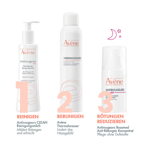 Die Eau Thermale Avène Antirougeurs CLEAN Beruhigende Reinigungsmilch ist eine sanfte, duftstofffreie und hochverträgliche Reinigungsmilch zur täglichen Reinigung von Gesicht, Augen und Lippen. Diese Gesichtsreinigung eignet sich insbesondere bei Rötungen, Couperose und Rosacea. Sie mildert Rötungen und beugt deren Neubildung vor. Auch als Begleitpflege während einer medikamentösen Rosacea-Therapie anzuwenden.