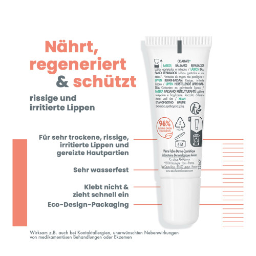 Die verbesserte Formulierung des Cicalfate+ Lippen Repair-Balsam repariert* spröde, rissige und gereizte Lippen innerhalb von 48 Stunden***. Sie ist sehr wasserfest, schützt, spendet 24 Stunden lang Feuchtigkeit** und pflegt intensiv. Die mit [C+-Restore]™, einem post-biotischen, reparierenden Aktivstoff und Avène Thermalwasser angereicherte Zusammensetzung beruhigt die Lippen und sorgt für eine schützende Barrierewirkung auf den Lippen. Dieses Pflegeprodukt für die ganze Familie besteht zu 96 % aus natürlichen Aktivstoffen und sorgt schon bei der ersten Anwendung für Wohlbefinden und Geschmeidigkeit