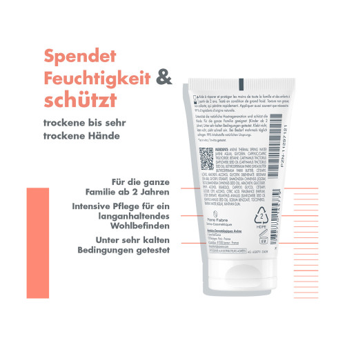 Diese pflegende Cold Cream Handcreme wurde unter extremen Kältebedingungen getestet und hinterlässt mit ihrer umhüllenden Textur und ihrem leichten Duft weiche, nicht fettende und nicht klebende Hände. Dank dem Cold Cream-Komplex von Eau Thermale Avène, einer traditionellen Mischung von Inhaltsstoffen aus der französischen Arzneimittellehre, nährt und beruhigt diese Handcreme und schützt vor Kälte und Trockenheit auch im Winter. Die reichhaltige Textur sorgt 24 Stunden* lang für Feuchtigkeit durch ein allmähliches Freisetzen ihrer Wirkstoffe. Sie ist einfach anzuwenden und zieht schnell ein. Die Hände werden wieder geschmeidig und fühlen sich sehr angenehm an.