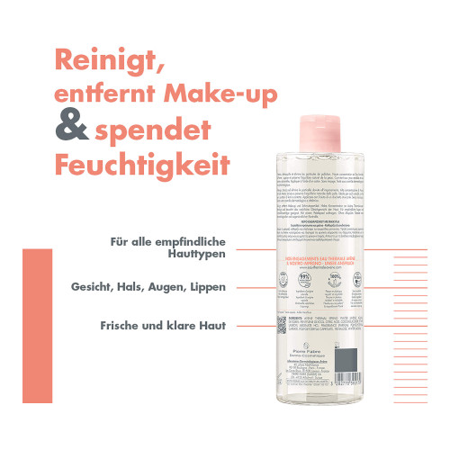 Dieses Mizellen-Reinigungslotion reinigt (sogar Verschmutzungspartikel*), spendet Feuchtigkeit** und beruhigt empfindliche Gesichts- und Augenpartien in einem einfachen Schritt. Sie enthält 99 % Aktivstoffe natürlichen Ursprungs und keine tierischen Bestandteile. Täglich entfernt dieses zart duftende Erfrischungswasser Make-up und schenkt Geschmeidigkeit in einem einfachen und schnellen Schritt. Es verbessert die Feuchtigkeitszufuhr und bewahrt das natürliche Gleichgewicht der Haut dank der Kombination von Glycerin und Trehalose und der hohen Konzentration des Avène Thermalwassers mit seinen beruhigenden Eigenschaften. Seine Formulierung enthält ein Minimum an Aktivstoffen in genau der richtigen Dosierung, um Wirksamkeit und Verträglichkeit zu gewährleisten***. Macht die Haut klar, weich, beruhigt und sorgt für Wohlbefinden. Die Mizellen-Reinigungslotion zum Entfernen von Make-up ist für Kontaktlinsenträger geeignet. Die 400-ml-Verpackung der Mizellen-Reinigungslotion zum Entfernen von Make-up besteht zu 87 % aus recycelten Materialien. Die Flasche besteht aus 100 % recyceltem Kunststoff****.