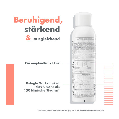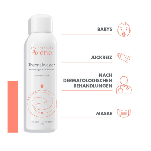 Das Thermalwasser-Spray beruhigt empfindliche, gereizte oder zu Allergien neigende Haut sofort. Das Thermalwasser von Avene, in das mehr als ein halbes Jahrhundert Erfahrung eingeflossen ist, strotzt nur so vor Mineralien und Spurenelementen, die für ein optimales Gleichgewicht der Mineralien und eine spezifische Mikroflora sorgen. Dadurch erhält es seinen einzigartigen und außergewöhnlichen Charakter, der die Haut beruhigt, ohne sie auszutrocknen, und macht es zu einem zentralen Bestandteil jeder Beauty-Routine. Es ist reich an Kieselsäure und bietet Weichheit und Komfort für ein sofortiges Wohlgefühl bei jeder Anwendung.