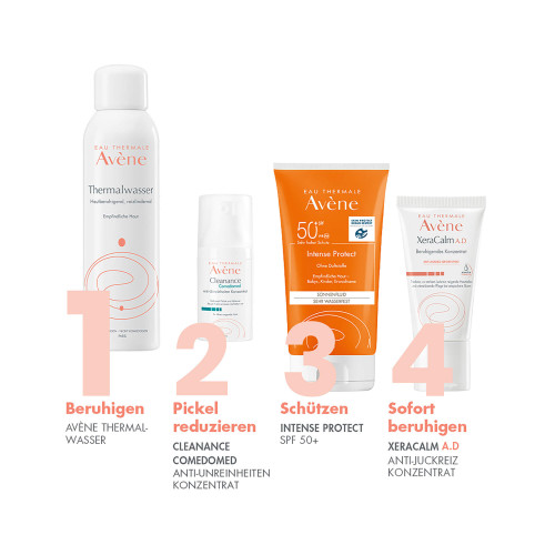 Ein Expertentipp: Für eine größere Wirksamkeit ist die Verwendung einer Kompresse die perfekte Lösung: falten Sie eine Kompresse, tränken Sie sie in Avène Thermalwasser, legen Sie sie auf den betroffene Bereich und sprühen Sie sie erneut ein. Lassen Sie es für 10 Minuten einwirken.