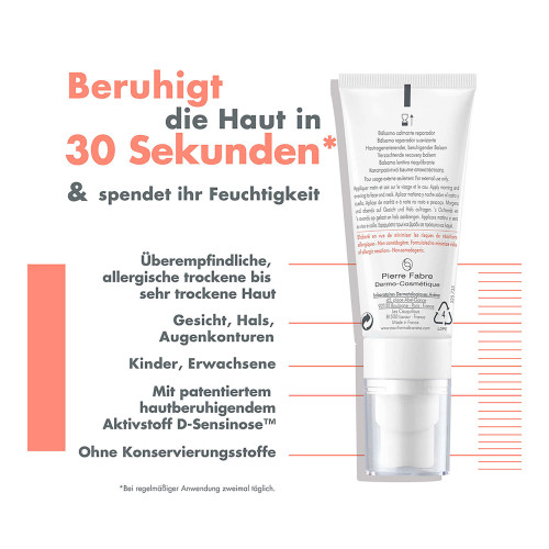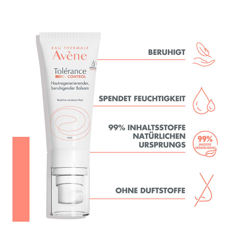 Der Tolérance Control Balsam für überempfindliche, allergische Haut oder reaktive Haut beruhigt die Haut in 30 Sekunden*. Dank D-Sensinose™, einem patentierten** post-biotischen Aktivstoff mit beruhigender Wirkung, werden Reizungen, Rötungen und Kribbel-, Spannungs- oder Hitzegefühle gelindert. Die Haut wird intensiv mit Feuchtigkeit versorgt und ihre Barriere in 48 Stunden*** wiederhergestellt. Die reichhaltige Textur ist besonders für trockene bis sehr trockene Haut zu empfehlen. Dieses hochverträgliche, duftstoff- und konservierungsstofffreie Hautpflegeprodukt profitiert von einem Sterile Cosmetics®-Pumpverschluss, durch den die Formulierung vor dem Eindringen von Luft und Bakterien geschützt ist und somit auch über die gesamte Anwendungsdauer hinweg steril bleibt.