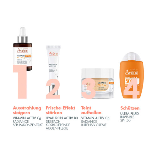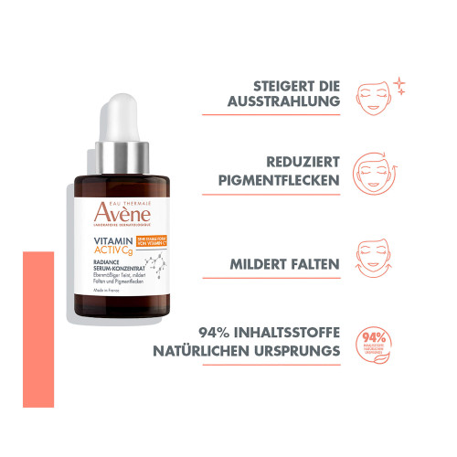 Die Zellalterung führt zu einer fortschreitenden Verschlechterung der Gewebefunktion. Auf der Ebene der Haut ist die Folge das Auftreten von klinischen Merkmalen wie Trockenheit, Pigmentierung, Erschlaffung und Falten. Die Avène Dermatological Laboratories haben das VITAMIN ACTIV Cg Radiance Serum-Konzentrat entwickelt, das 3 dermatologische Aktivstoffe enthält: