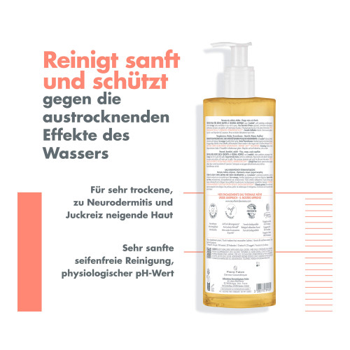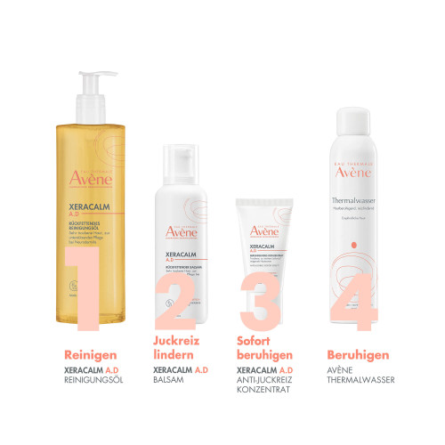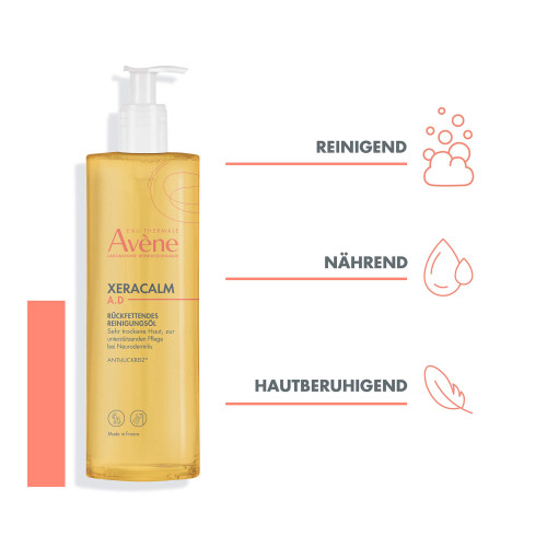 XeraCalm A.D Rückfettendes Reinigungsöl reinigt sanft und beruhigt sehr trockene, zu Neurodermitis und Juckreiz neigende Haut. Als erster Schritt in der Anti-Juckreiz-Routine macht sie die Haut weich und komfortabel und schont das Mikrobiom der Haut. Es ist seifenfrei und hat einen physiologischen pH-Wert, so dass es bei Entzündungen im Gesicht, am Körper und auf der Kopfhaut angewendet werden kann. Die Formulierung beinhaltet den ersten postbiotischen Aktivstoff aus dem Avène Thermalwasser, I-modulia®, der Juckreiz reduziert*, die Abwehrkräfte der Haut stimuliert und Irritationen bekämpft, mit Cer-omega, hautähnlichen Lipiden, die für ihre nährende und wiederherstellende Auswirkungen auf die Hautbarriere bekannt sind, und Avène Thermalwasser, das auf natürliche Weise beruhigend, ausgleichend und stärkend wirkt. Parfümfrei und so formuliert, dass das Risiko allergischer Reaktionen minimiert wird, brennt XeraCalm A.D Rückfettendes Reinigungsöl nicht in den Augen und ist ideal für die Haut von Neugeborenen, Kindern und Erwachsenen.