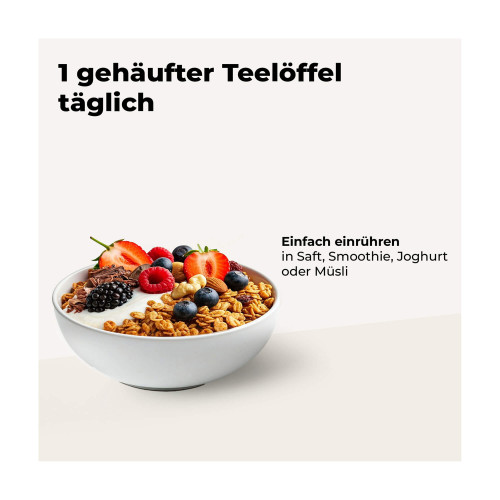 5 g (ca. 1 gehäufter Teelöffel) Hagebuttenpulver täglich in etwa 200ml Saft, Smoothie, Joghurt, Quarkspeisen oder Müsli einrühren.