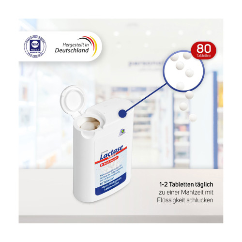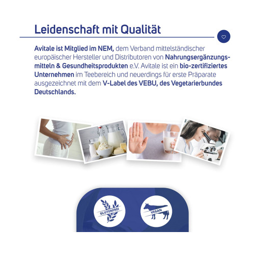 Avitale Lactase 14000 FCC Tabletten sind gluten- und sojafrei und werden in Deutschland von einem zertifizierten Arzneimittelhersteller produziert.