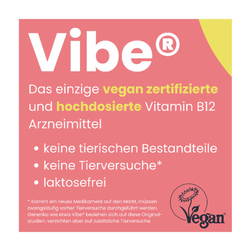 Vibe® ist ein Vitamin B12-Präparat zur Behandlung einer bestimmten Art von Blutarmut (Anämie). Es wird bei Erwachsenen angewendet zur Langzeitbehandlung von Blutarmut durch Vitamin-B12-Mangel (genannt perniziöse Anämie), nachdem die Blutwerte durch eine Behandlung mit Vitamin B12-Spritzen auf normale Werte gebracht wurden.