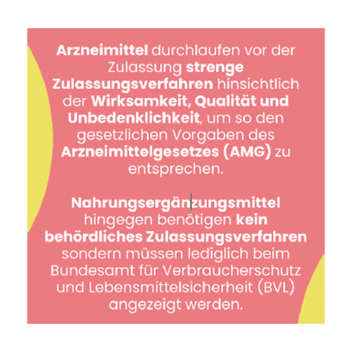 Im Gegensatz zu Nahrungsergänzungsmitteln unterliegt axunio Vibe® als Arzneimittel strengeren Zulassungsverfahren, die die Wirksamkeit, Qualität und Unbedenklichkeit sicherstellen und die Vorgaben des Arzneimittelgesetzes (AMG) erfüllen. Nahrungsergänzungsmittel hingegen benötigen keine behördliche Zulassung, sondern nur eine Anzeige beim Bundesamt für Verbraucherschutz und Lebensmittelsicherheit (BVL).