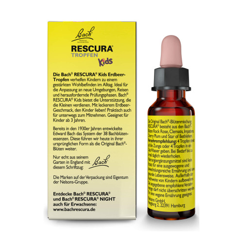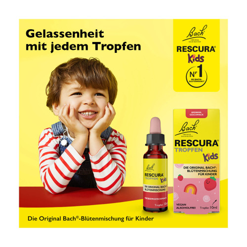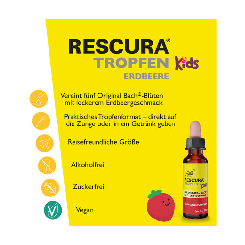 BACH RESCURA® Kids Erdbeer Tropfen enthalten die Original Bach®-Blütenmischung RESCURA®. Speziell für Kinder ohne Alkohol mit leckerem Erdbeer-Geschmack! Sie werden gerne verwendet in anspruchsvollen Alltagssituationen.