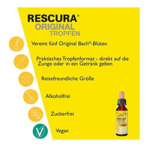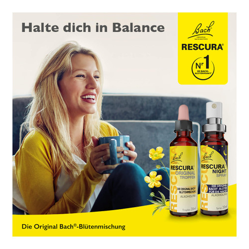 Die Original Bach RESCURA Mischung in der kultigen gelben Flasche unterstützt das emotionales Wohlbefinden und die innere Balance wenn Arbeit, Flugangst, Klausuren oder soziale Verpflichtungen überwältigend werden.