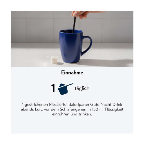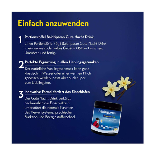 Mit dem Gute Nacht Drink setzt Baldriparan® auf eine innovative Einschlafbegleitung mit echtem Wohlfühlmoment. Der Baldriparan Gute Nacht Drink unterstützt den Körper beim Einschlafen und ermöglicht dadurch eine erholsame Nacht. Die natürliche Vanillenote des Produkts lässt sich ganz individuell mit bestehenden Lieblingsgetränken kombinieren und schafft so eine milde Ergänzung, die sich warm oder kalt genießen lässt.