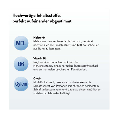 1 Melatonin, das zentrale Schlafhormon, verkürzt nachweislich die Einschlafzeit und hilft so, schneller zur Ruhe zu kommen