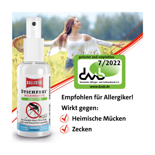Erleben Sie zuverlässigen Insektenschutz, der speziell für empfindliche Haut entwickelt wurde! Ballistol Stichfrei Sensitive schützt effektiv vor Mücken, Zecken und Bremsen – und das ohne reizende Inhaltsstoffe. Dank seiner milden, hautfreundlichen Formel ist es ideal für Allergiker, Asthmatiker, Schwangere und Kinder geeignet.