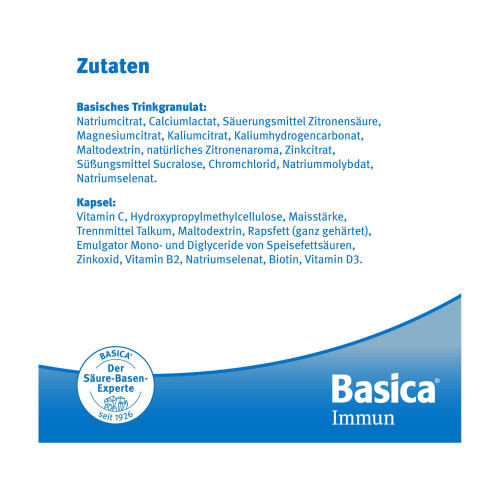 Basisches Trinkgranulat: Natriumcitrat, Calciumlactat, Säuerungsmittel Zitronensäure, Magnesiumcitrat, Kaliumcitrat, Kaliumhydrogencarbonat, Maltodextrin, natürliches Zitronenaroma, Zinkcitrat, Süßungsmittel Sucralose, Chromchlorid, Natriummolybdat, Natriumselenat.