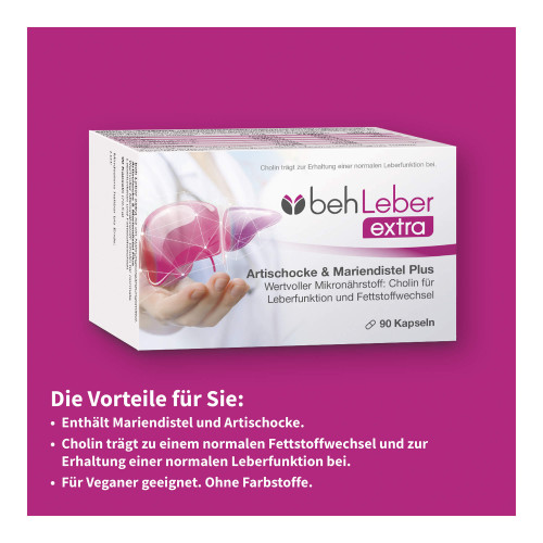 beh Leber extra enthält eine auf wissenschaftlichen Erkenntnissen beruhende Auswahl von Mikronährstoffen. Hauptbestandteil ist ein patentierter Vitaminkomplex aus B6, B12 und Folsäure, kombiniert mit Traubenkern- Artischocken- und Mariendistelsamenextrakt und Cholin.