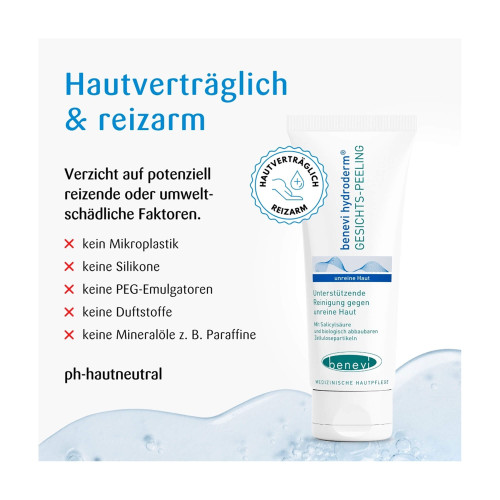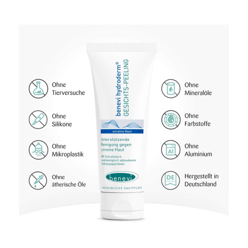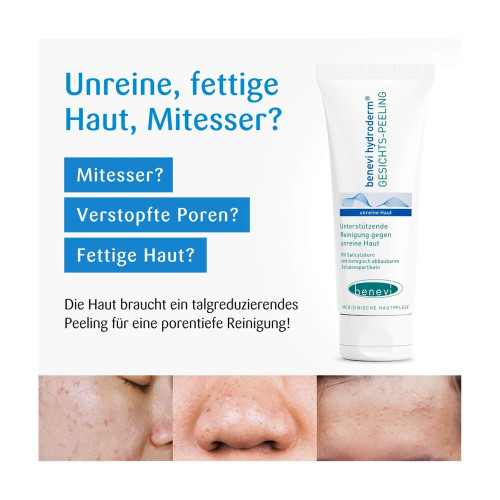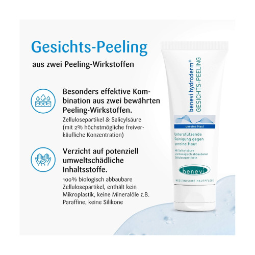 benevi hydroderm Gesichtspeeling ist ein dermatologisch getestetes Peeling für fettige, zu Unreinheiten neigende Haut. Die Kombination aus 2 % Salicylsäure und plastikfreien Zellulosepartikeln entfernt überschüssigen Talg und abgestorbene Hautschüppchen gründlich. Die porentiefe Reinigung hilft, Mitessern und Hautunreinheiten vorzubeugen. Die regelmäßige Anwendung fördert ein klareres, feinporiges Hautbild – ohne zu fetten. Ideal ergänzend: benevi hydroderm Gesichtsreinigung zur täglichen Reinigung und das Gesichtsfluid plus zur leichten, mitesserlösenden Feuchtigkeitspflege.
