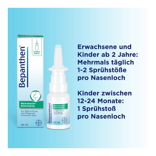 Bepanthen® Meerwasser-Nasenspray ist eine wässrige Lösung zum Einsprühen in die Nase. Es wird angewendet zur Befeuchtung und Reinigung der Nasenschleimhaut, auch als Therapiebegleitung bei Erkältung oder Heuschnupfen. Außerdem bewahrt Bepanthen® Meerwasser-Nasenspray vor einer trockenen Nase, hervorgerufen durch trockene Luft in beheizten oder klimatisierten Räumen, Rauch oder Staub.