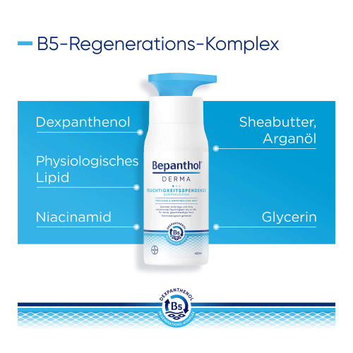 Der B5-Regenerations-Komplex unterstützt die Regeneration der Haut – von innen nach außen. Dabei fördert Dexpanthenol in tieferen Hautschichten der Epidermis die natürliche Zellregeneration. Das enthaltene Glycerin spendet sofortige und lang anhaltende Feuchtigkeit. Niacinamid (Vitamin B3) beruhigt juckende, trockene Haut und natürliche Lipide wie Sheabutter und Arganöl ergänzen fehlende Hautlipide. Das physiologische Lipid unterstützt zusätzlich die Anordnung der Doppellipidschicht.