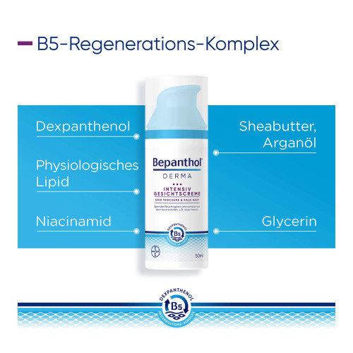 Der einzigartige B5-Regenerations-Komplex der Bepanthol® DERMA Intensiv Gesichtscreme kombiniert Inhaltsstoffe, die auch in tiefere Schichten der Epidermis gelangen und so eine der Hauptursachen trockener Haut angehen.